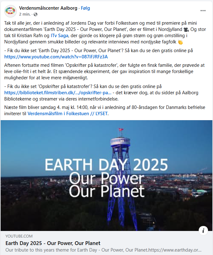 Jordens Dag afholdes hvert år d. 22. april, og 2025-temaet var ‘Our Power, Our Planet’. Her bidrog vi med en mini dokumentarfilm, hvor vi satte fokus på grøn strøm og grøn omstilling i samarbejde med nordjyske fagfolk.